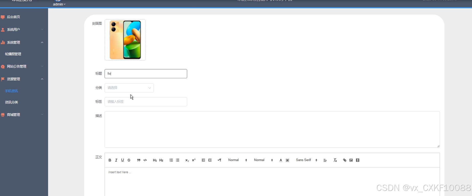 资源管理:发布和管理手机资讯和资讯分类,新增、编辑或删除资讯分类,支持分类属性设置和调整。