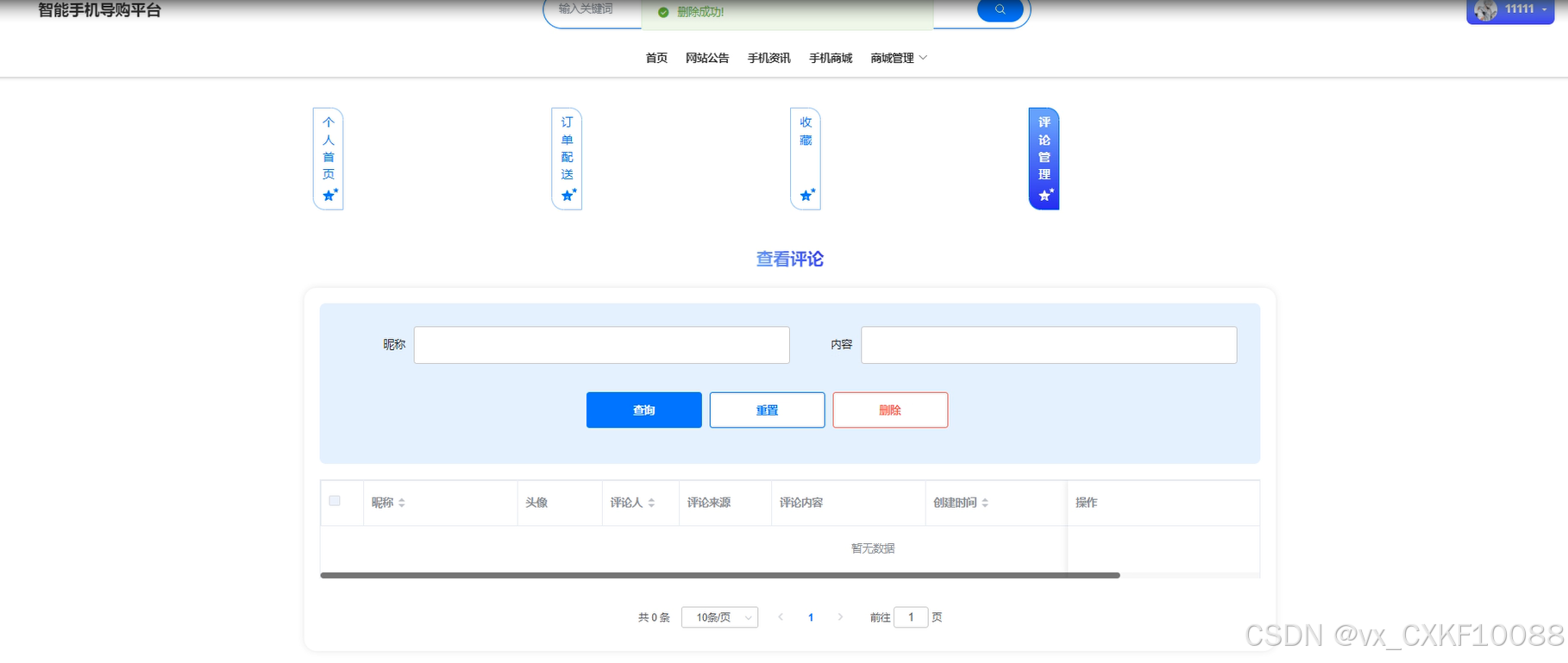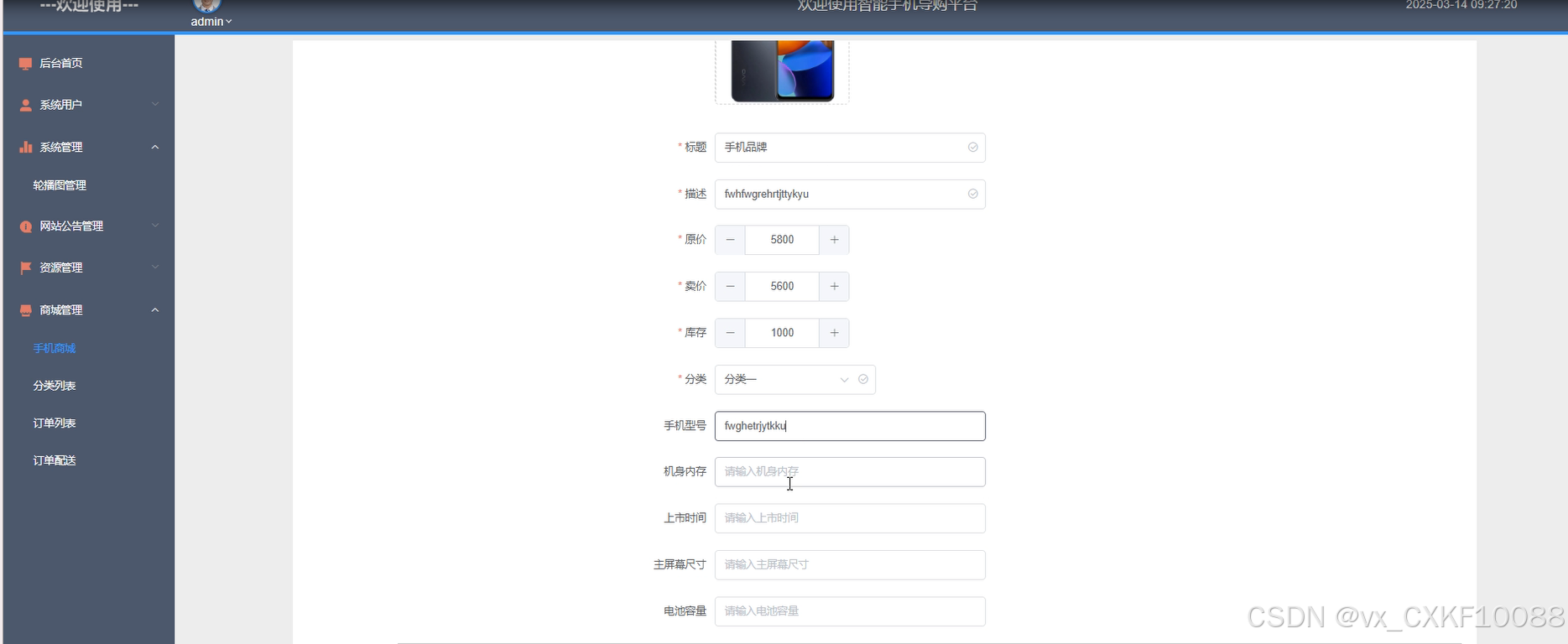 商城管理:管理员可以管手机商城、分类列表、订单列表、订单配送等信息,可以进行增删改查等操作。