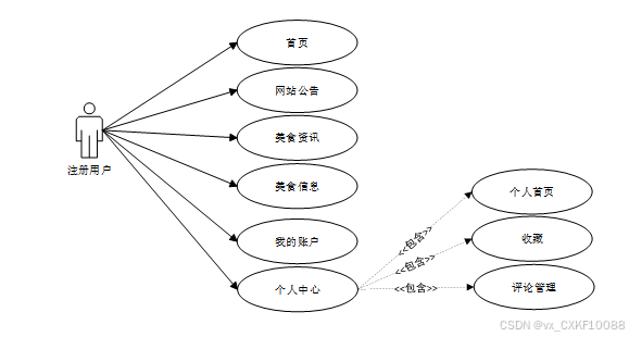 用户通过平台可以轻松浏览到最新的美食推荐、餐厅信息以及优惠活动等,通过首页、网站公告、美食资讯等功能获取及时的饮食信息,同时还能管理个人账户,查看订单、收藏餐厅与菜品,参与评论和互动,提升个性化体验。整体而言,平台为用户提供了一个便捷、高效的餐饮信息获取与管理中心,让用户能够随时随地做出理想的就餐决策,并享受个性化的服务和推荐。注册用户角色用例图如下所示。