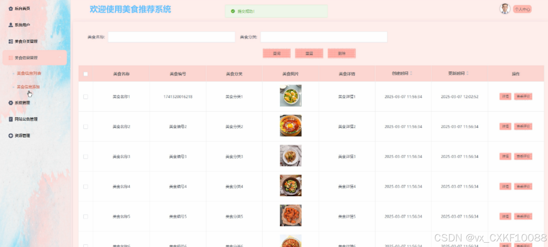 美食信息管理:美食信息管理功能使管理员能够更新、编辑和删除餐厅和菜品的详细信息,包括名称、价格、简介、图片等,确保平台展示的菜品信息始终保持准确、清晰和最新,提升用户选择时的决策效率和平台内容的可用性。