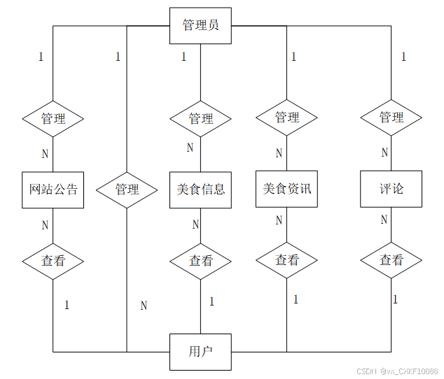 借助先进的系统,E-R图使其他用户可以快速轻松地了解系统的功能以及他们之间的关系。根据美食推荐系统分析结果,本美食推荐系统总体E-R图如下图所示。