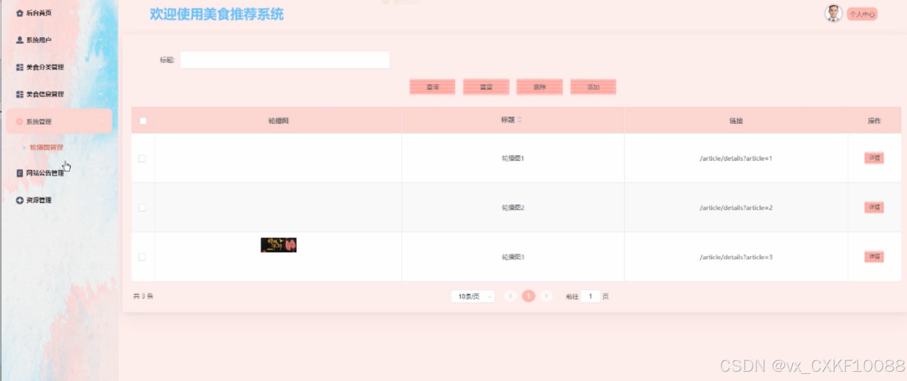 系统管理(轮播图管理):系统管理中的轮播图管理功能使管理员可以对平台首页的广告轮播图进行添加、删除和更新,确保首页的动态展示始终与当前的促销活动或热点内容一致,提升平台的吸引力和用户的参与度,同时优化页面布局和用户导航。
