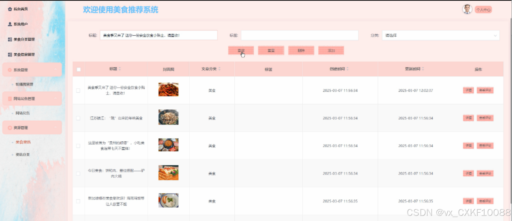 资源管理(美食资讯、资讯分类):资源管理功能帮助管理员维护和更新平台的美食资讯栏目,包括对资讯分类、内容更新和管理等,确保平台上的信息始终紧跟行业热点、饮食趋势和用户兴趣,增强平台的内容价值和知识共享功能,提升用户的持续关注度。