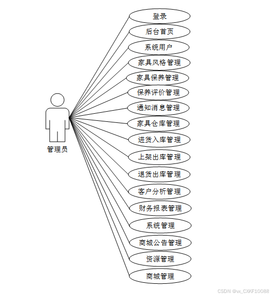 零售家具商城主要涉及有顾客用户、管理员两个角色。每个角色对应的功能模块如图所示。