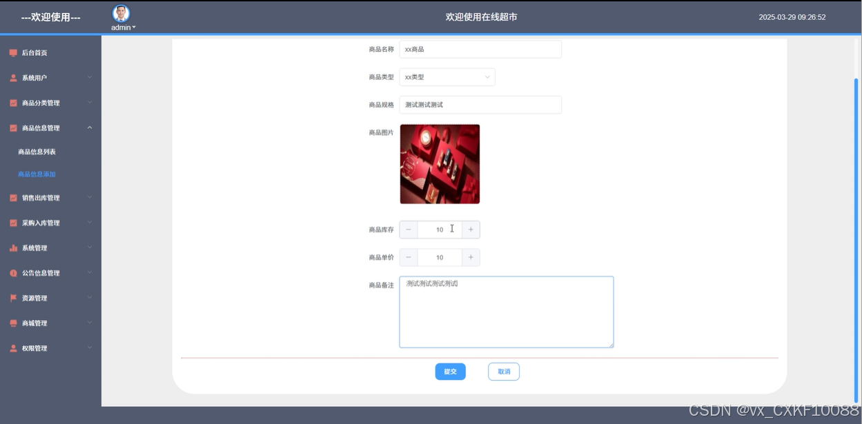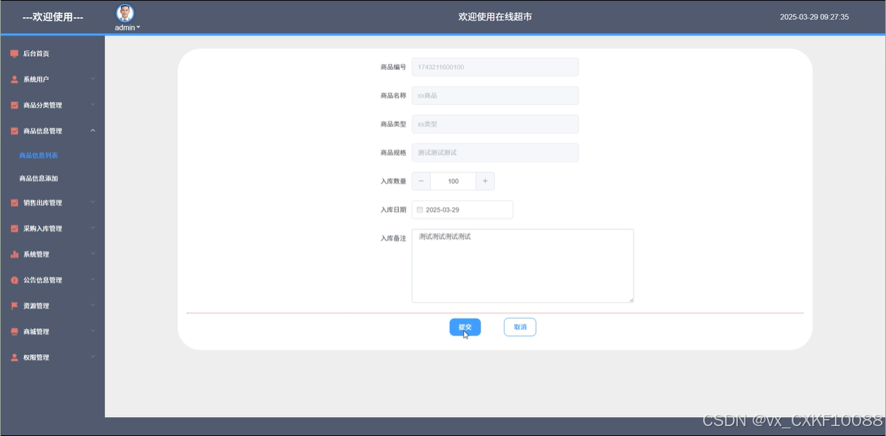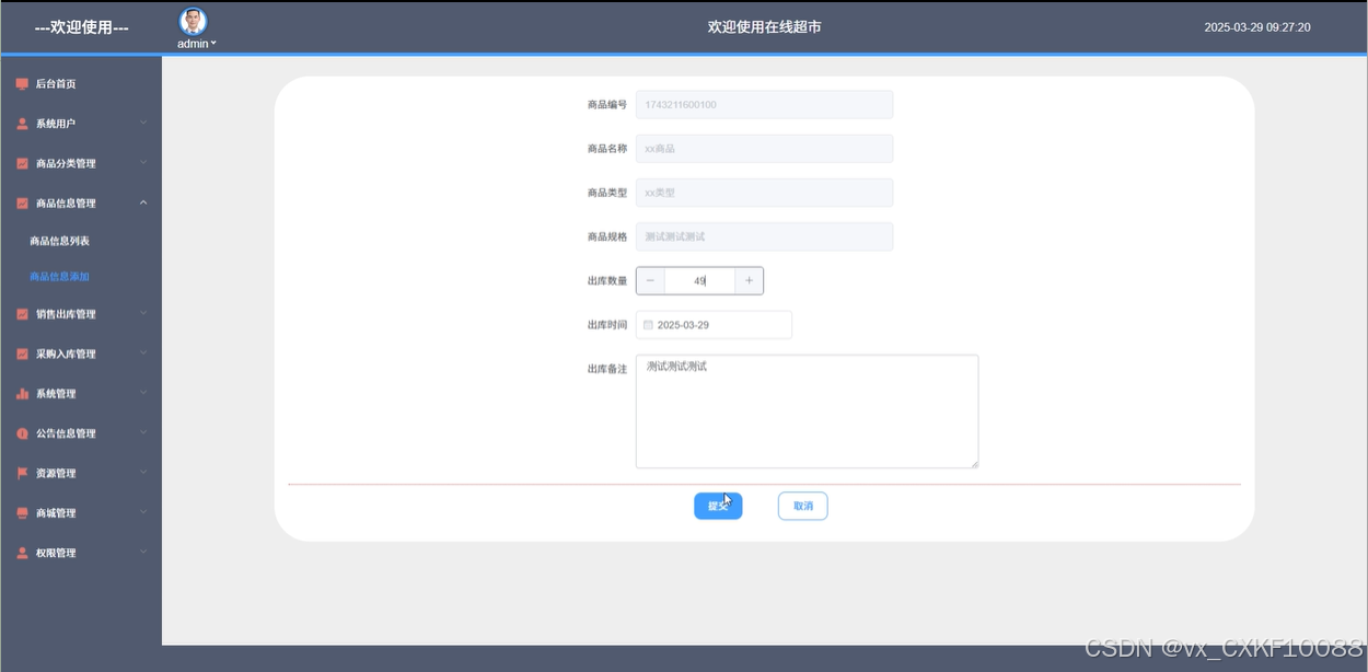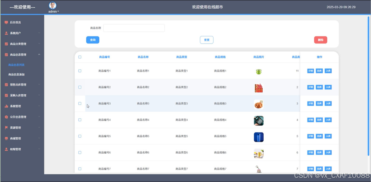 商品信息管理:管理员可以查看所有商品的信息,并进行商品的出库、入库管理。还可以对商品进行添加、删除、查询、搜索等操作,并设置库存预警,及时处理库存问题。