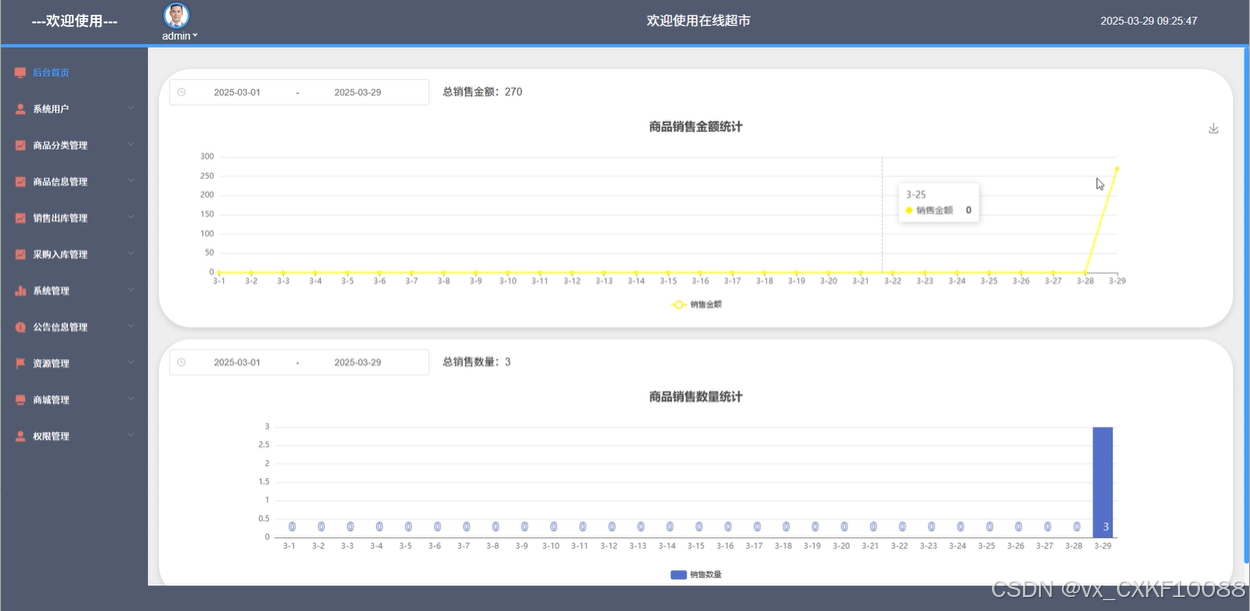 后台首页:在后台首页,管理员可以查看商品的销售统计数据,包括销售金额、销售数量等,并通过各类折线图展示销售趋势。管理员也可以修改个人资料和登录密码,保障账户安全。