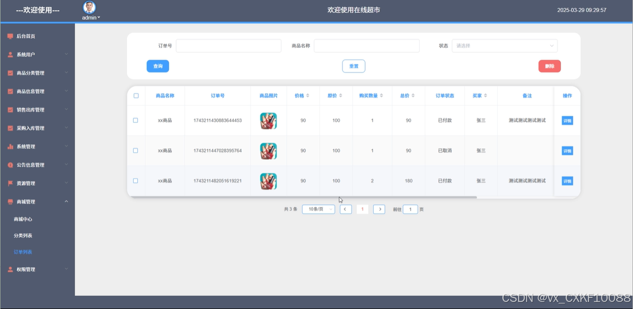 商城管理:管理员可以查看和修改商城中心中的商品信息、分类列表、用户评论等,并支持增删改查功能。此外,管理员还可以管理订单列表,查看用户订单详情,通过订单号、商品名称、选择状态进行搜索、查询、重置和删除。