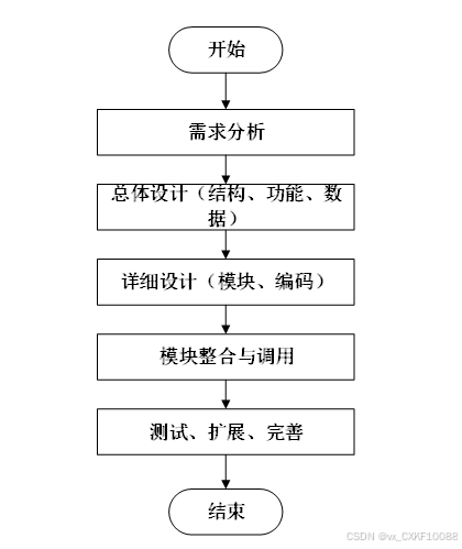 系统开发流程的主要步骤,从需求分析到系统完成的全过程。流程包括需求分析、总体设计(结构、功能、数据)、详细设计(模块、编码)、模块整合与调用,以及测试、扩展和完善,最终完成系统的开发。本系统的开发流程如下图所示