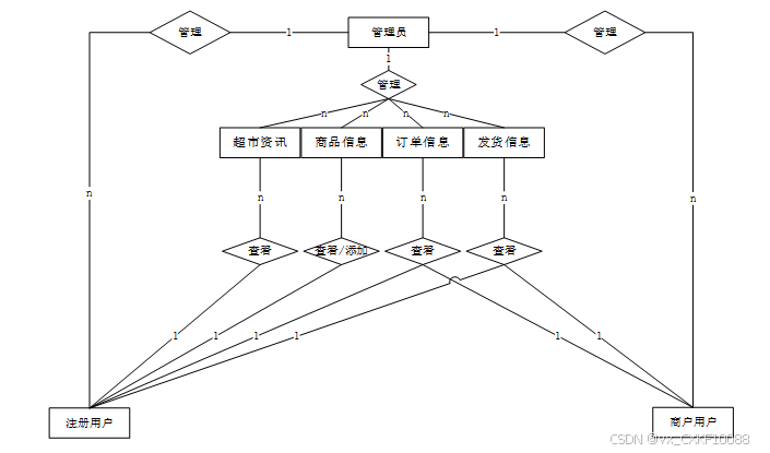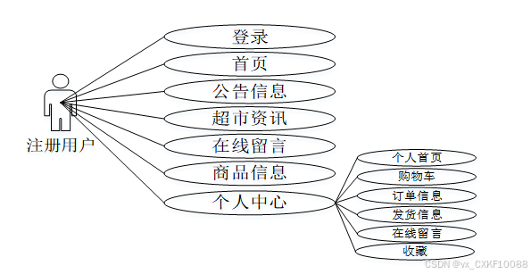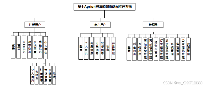 基于Apriori算法的超市商品推荐系统主要划分为了注册用户、商户用户和管理员三大部分,以下是各个部分的具体功能分析。