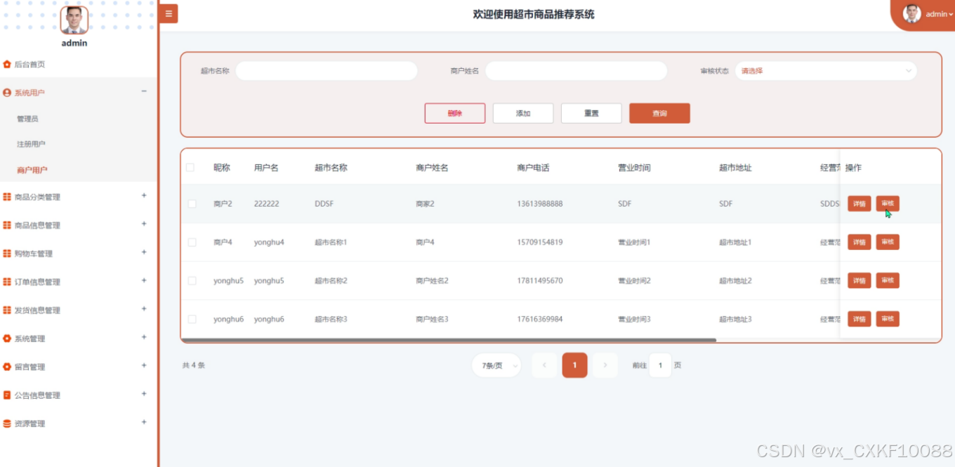 "Supermarket Commodity Recommendation System Based on Apriori Algorithm" is developed in Python language, uses Flask framework to build back-end services, and combines MySQL database to achieve data storage and management. The system analyzes the customer's shopping basket data to mine the mix of frequently purchased products, so as to provide users with personalized product recommendation services. As the core association rule learning method, the Apriori algorithm can efficiently identify the collection of goods that are frequently purchased together (i.e., the frequent item set) and generate recommendation suggestions based on these findings. The front-end of the system provides a variety of functional modules for different types of users, including product browsing, shopping cart management, order tracking for registered users, product information maintenance and review management for merchant users, and comprehensive background management functions for administrators, such as user management, product classification management, order information management, etc.