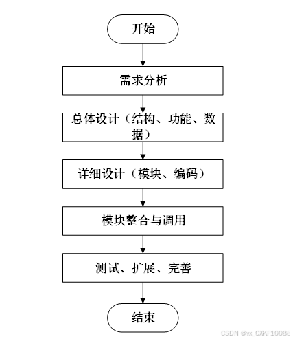 系统开发流程的主要步骤,从需求分析到系统完成的全过程。流程包括需求分析、总体设计(结构、功能、数据)、详细设计(模块、编码)、模块整合与调用,以及测试、扩展和完善,最终完成系统的开发。本系统的开发流程如图3-3所示