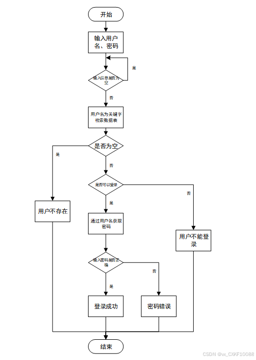 用户输入用户名和密码后,系统先检查输入是否为空,再验证用户名是否存在,若存在则通过用户名获取密码并校验。若密码正确则登录成功,否则提示密码错误。若用户名不存在或无法登录,提示用户操作无效。如图3-4所示。