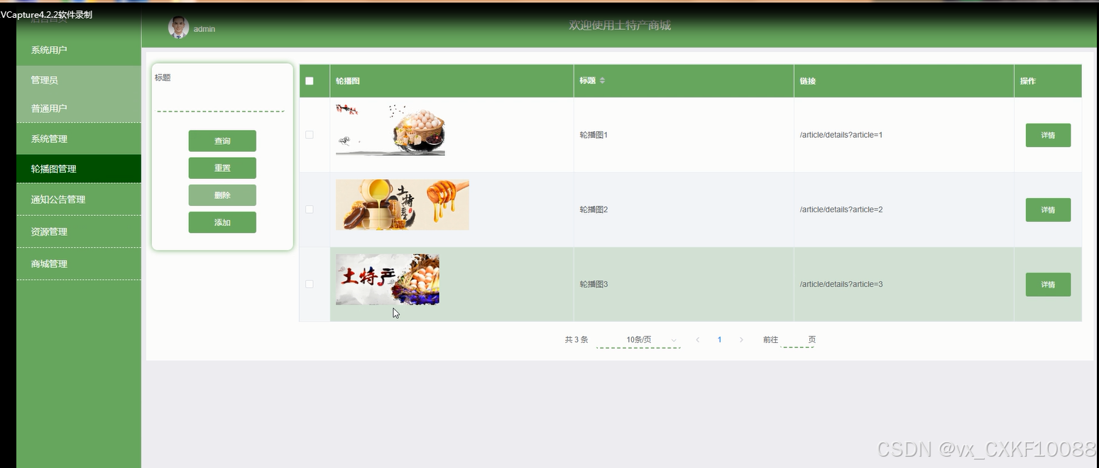 管理员可以管理商城中的特产资讯,支持查询、重置、删除和添加新的资讯文章。每篇文章包括内容、分类、标签等,可以根据需求编辑、删除或发布新的资讯。同时,管理员还可以查看资讯的评论,处理不当评论或与用户互动。资源管理界面如图5-7所示。