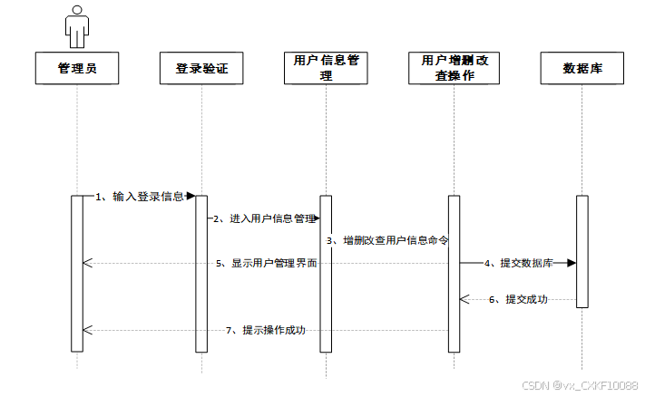 管理员输入登录信息后,进入用户信息管理模块,选择增删改查操作并提交命令至数据库。数据库执行操作后返回成功状态,系统显示用户管理界面并提示操作成功。管理员修改用户信息时序图如图4-5所示。