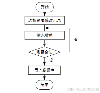 用户首先选择需要修改的记录,输入修改后的数据,系统判断输入数据是否合法。若数据不合法,提示重新输入;若数据合法,则将修改后的数据写入数据库,完成操作后流程结束。修改信息流程图如图3-7所示。