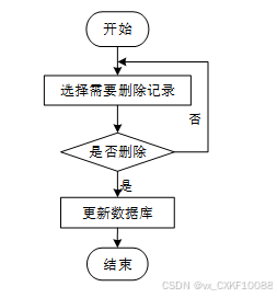 用户选择需要删除的记录后,系统判断是否确认删除。若未确认,返回选择环节;若确认删除,则更新数据库,删除对应记录,完成操作后流程结束。删除信息流程图如图3-8所示。