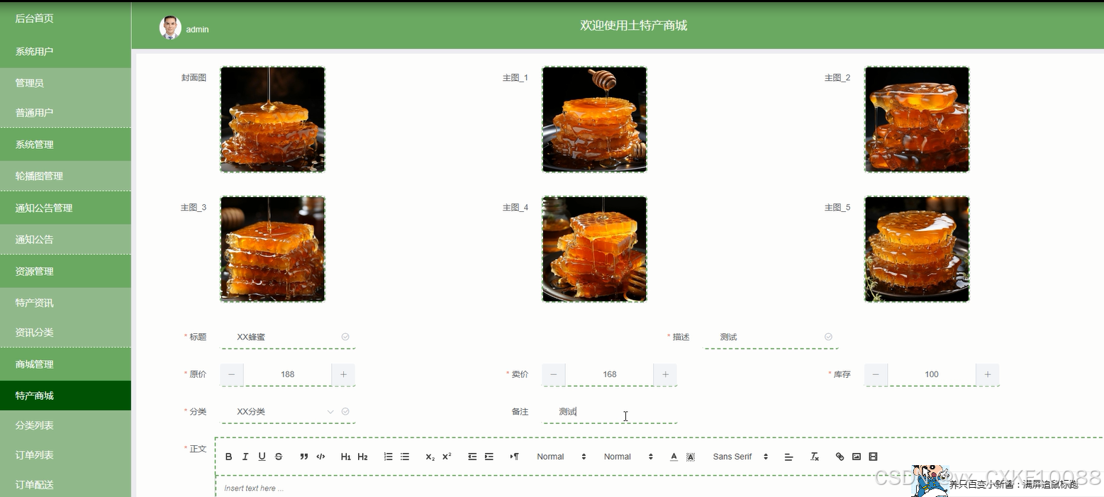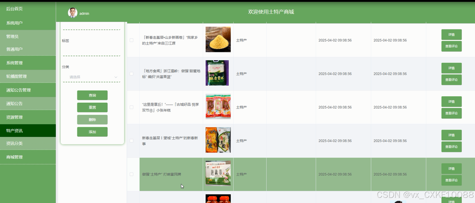 管理员高效管理土特产商城的运营事务,包括商品信息、订单处理、资讯更新等。通过这些功能,管理员能够确保商城信息的准确性、订单配送的顺畅、用户交流的健康,提升商城的整体服务水平和用户体验。
