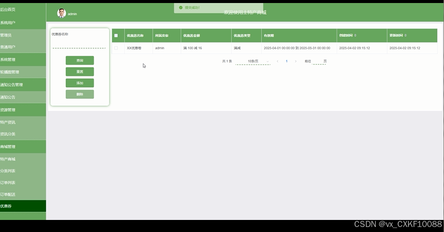 管理员可以查询重置添加删除优惠券,添加优惠券时设置优惠券的名称、金额、类型(如满减、折扣)、有效期等详细信息。优惠券管理界面如图5-9所示。