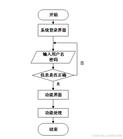 用户首先进入系统登录界面,输入用户名和密码后,系统验证信息是否正确。若验证失败,返回登录界面重新输入;若验证成功,则进入功能界面,执行相应功能处理后结束操作流程。操作流程如图3-5所示。