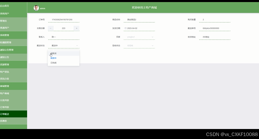管理员可以根据订单的实际配送进度,更新订单状态,例如设置为“待取货”、“配送中”或“已完成”。管理员需要跟踪订单的配送情况,确保商品及时送达顾客。订单配送管理界面如图5-8所示。