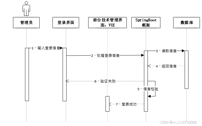 管理员输入登录信息后,登录界面将信息传递至前台管理界面,随后通过SpringBoot框架读取数据库中的用户信息并返回。系统验证信息,若验证成功则登录成功,若验证失败则返回错误提示。登录时序图如图4-4所示。