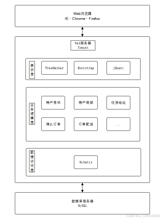 基于微信小程序的土特产商城系统由表现层、业务逻辑层、数据访问层和数据库组成。表现层通过微信小程序与用户交互,使用WXML、WXSS和JavaScript呈现界面。业务逻辑层采用SpringBoot框架处理核心功能,确保模块化和高效性。数据访问层通过MyBatis框架与MySQL数据库进行连接,执行数据操作。MySQL用于存储商品、订单和用户数据,保证数据的持久化与安全。系统通过Nginx和Tomcat服务器协同工作,确保高效的用户请求处理和系统稳定性。整个系统架构如图4-1所示。
