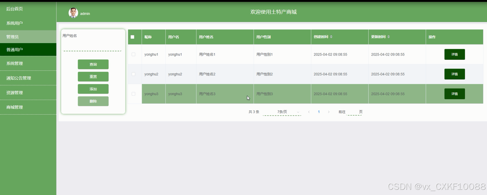 普通用户可以浏览商品信息、分类和详细介绍,管理购物车并确认订单,选择支付方式和使用优惠券。可以实时查看订单的物流进度,跟踪配送状态,并查看历史订单。此外,用户可以浏览与土特产相关的资讯,进行点赞、评论和收藏。