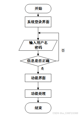 用户首先进入系统登录界面,输入用户名和密码后,系统验证信息是否正确。若验证失败,返回登录界面重新输入;若验证成功,则进入功能界面,执行相应功能处理后结束操作流程。操作流程如图3-5所示。