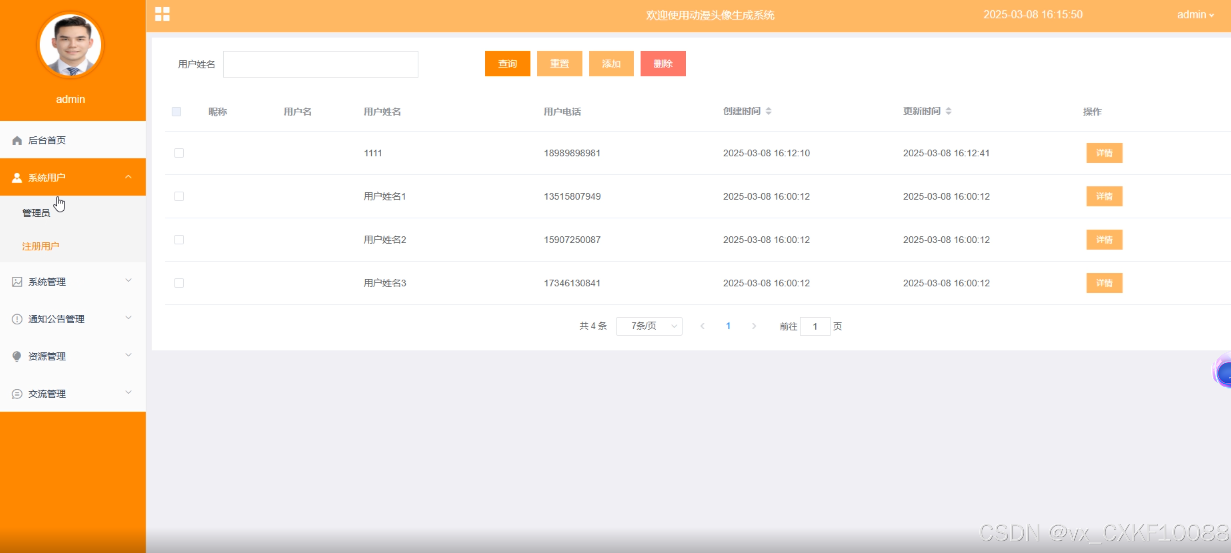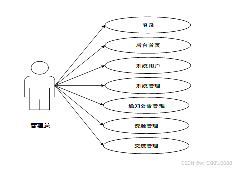 管理员可查看后台首页、系统用户,系统管理、通知公告管理、资源管理、交流管理。