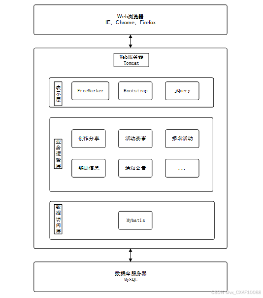 系统由表现层、业务逻辑层、数据访问层和数据库服务器组成。表现层通过浏览器(如IE、Chrome、Firefox)与用户交互,采用FreeMarker、Bootstrap、jQuery等技术实现界面呈现。业务逻辑层负责处理系统的核心业务逻辑,通过分模块设计实现功能分离。数据访问层使用MyBatis框架连接数据库,执行数据的增删改查操作。数据库服务器采用MySQL进行数据存储和管理,为系统提供稳定的数据库支持。整个架构通过Tomcat服务器完成用户请求的接收和处理,确保系统的高效运行。整个系统架构如图4-1所示。