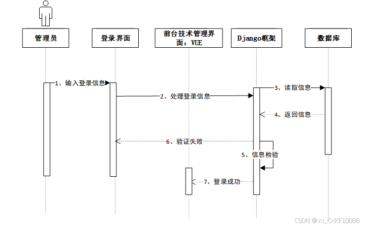 管理员输入登录信息后,登录界面将信息传递至前台管理界面,随后通过Django框架读取数据库中的用户信息并返回。系统验证信息,若验证成功则登录成功,若验证失败则返回错误提示。登录时序图如图4-4所示。