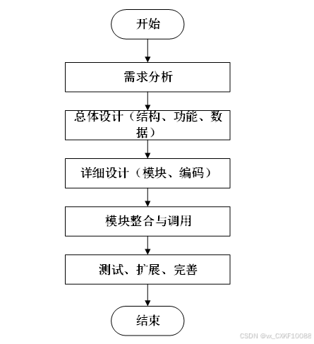 系统开发流程的主要步骤,从需求分析到系统完成的全过程。流程包括需求分析、总体设计(结构、功能、数据)、详细设计(模块、编码)、模块整合与调用,以及测试、扩展和完善,最终完成系统的开发。本系统的开发流程如图3-3所示