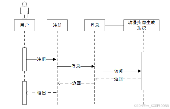 用户通过注册模块发送注册请求,系统完成注册后返回确认信息。随后,用户通过登录模块发送登录请求,系统验证用户信息后允许访问目标系统。用户完成操作后可选择退出,系统终止会话。注册时序图,如图4-3所示。