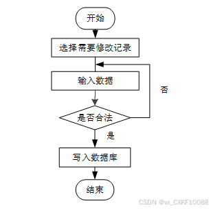 用户首先选择需要修改的记录,输入修改后的数据,系统判断输入数据是否合法。若数据不合法,提示重新输入;若数据合法,则将修改后的数据写入数据库,完成操作后流程结束。修改信息流程图如图3-7所示。