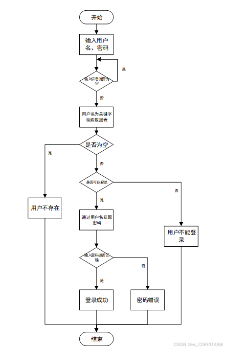 用户输入用户名和密码后,系统先检查输入是否为空,再验证用户名是否存在,若存在则通过用户名获取密码并校验。若密码正确则登录成功,否则提示密码错误。若用户名不存在或无法登录,提示用户操作无效。如图3-4所示。