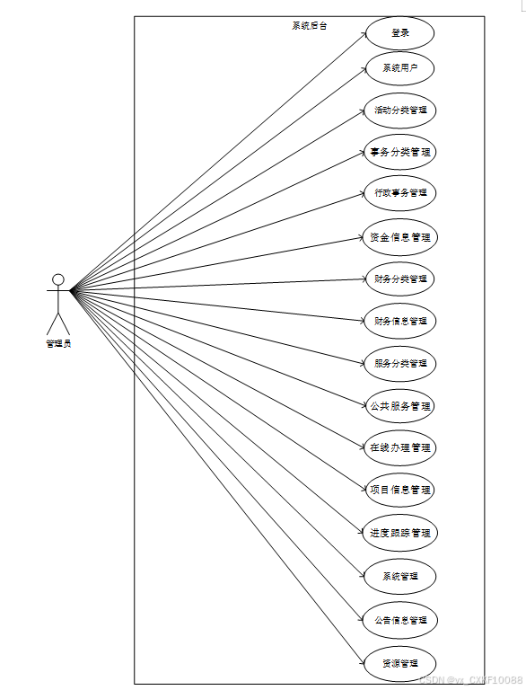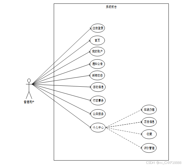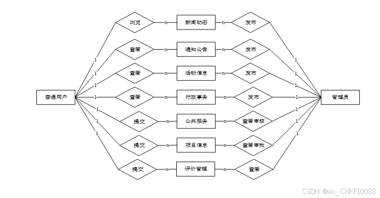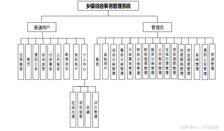 乡镇综合事务管理系统设计分为两个主要用户角色:普通用户和管理员。以下是对每个角色的功能需求的详细描述。