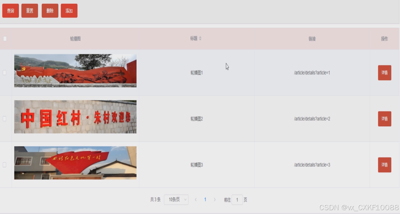 管理员对首页的轮播图进行管理,进行查询、添加、删除操作及可设置轮播图的跳转链接。轮播图界面如图5-13所示。