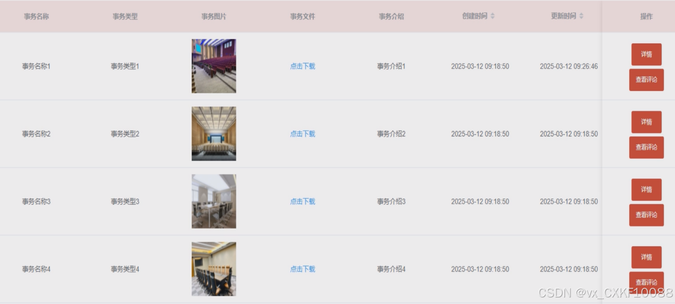 管理员可查看行政事务列表及点击下载文件,可以创建新的行政事务类型,编辑或删除现有的类型。事务包含类型、图片、文件、介绍、详情等相关信息。行政事务管理界面如图5-10所示。