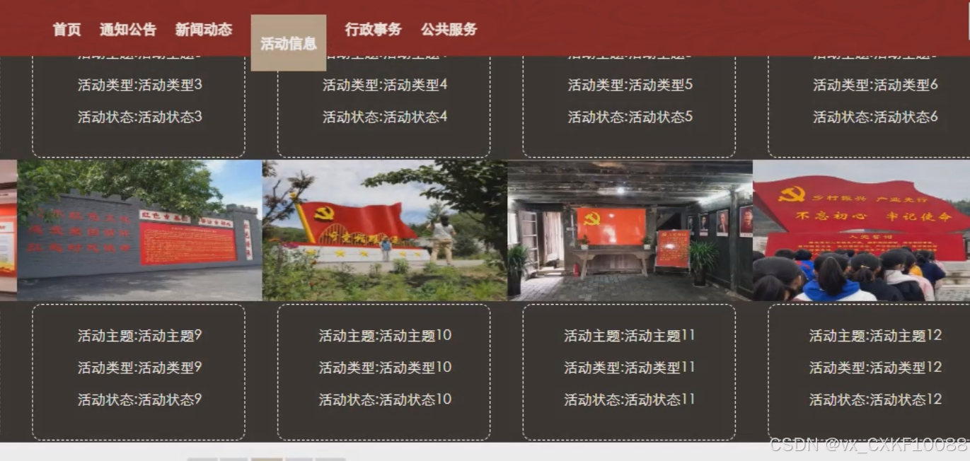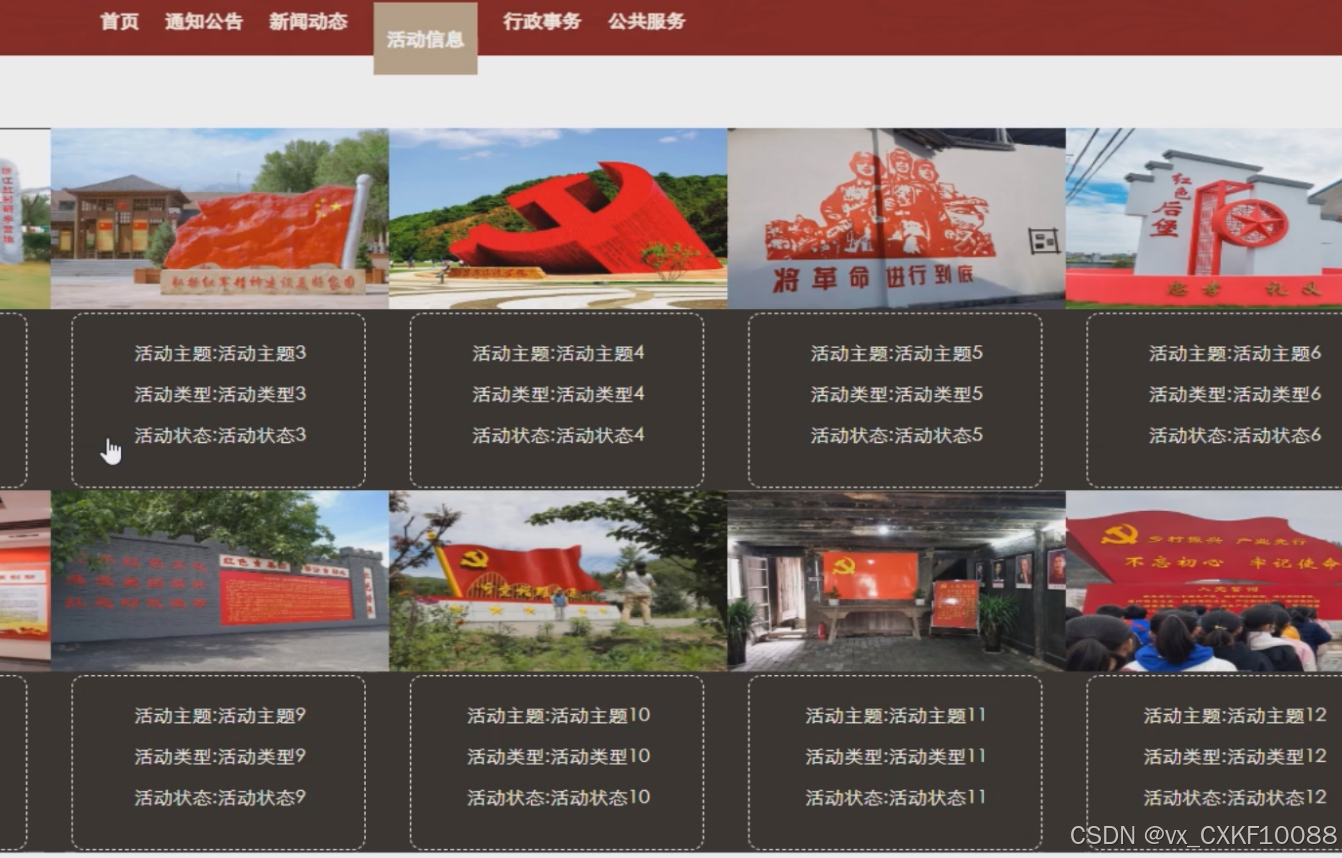 - 活动信息:用户可以浏览活动列表,查看具体的活动信息,包括主题、类型、状态、举行地点、时间、简介等相关信息,可以对活动信息进行点赞、收藏和评论等操作。