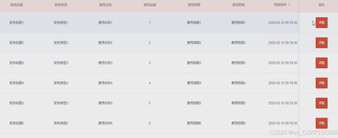 管理员可查看财务信息列表,可以创建新的财务信息名称,包含类型、标题、名称、总额、明细、周期等相关信息。财务信息管理界面如图5-11所示。