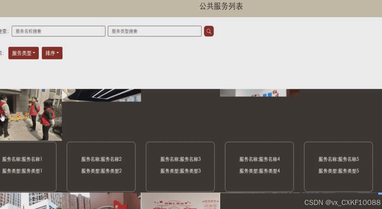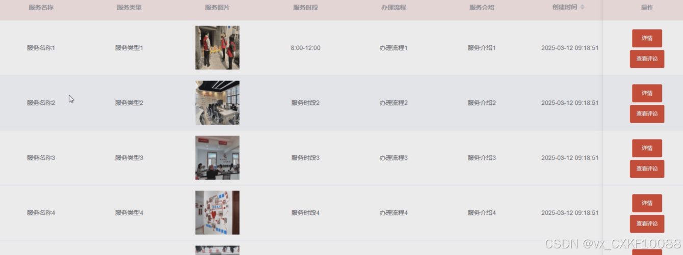 用户可以浏览公共服务列表, 支持服务类型搜索;点击可查看详情,包含名称、类型、服务时段、办理流程、服务介绍、服务详情等相关信息;可以对服务信息进行点赞、收藏、评论、在线预约等操作;预约信息包含服务类型、服务时段、用户姓名、预约时间、预约备注等信息;提交预约后需管理员进行审核。公共服务界面展示如图5-4所示。