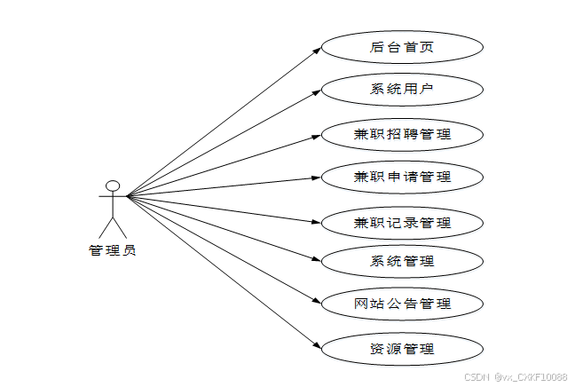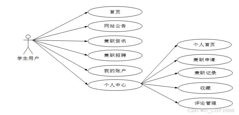 本大学生兼职网站设计分为两个主要用户角色:学生用户和管理员。以下是对每个角色的功能需求的详细描述。