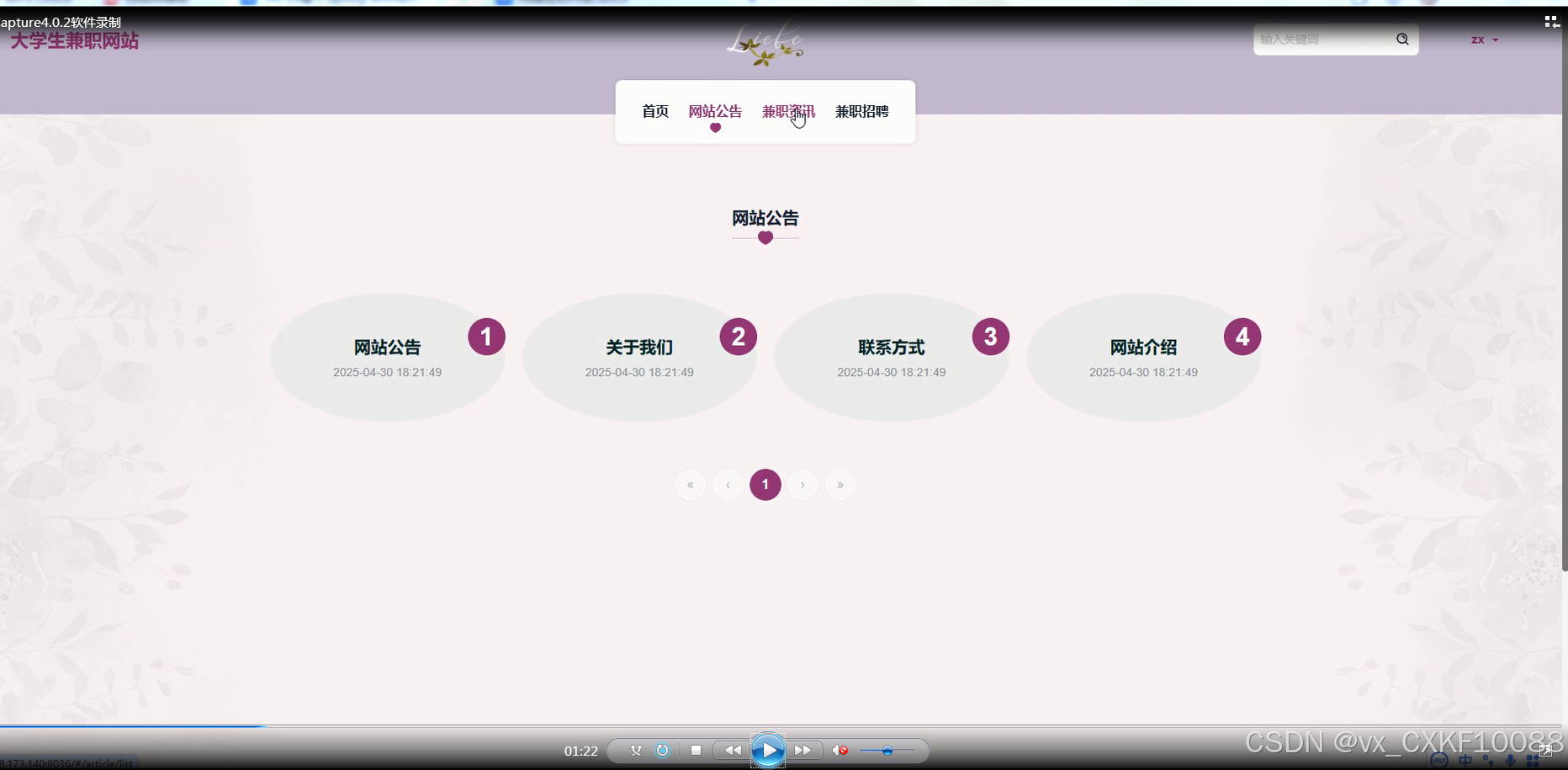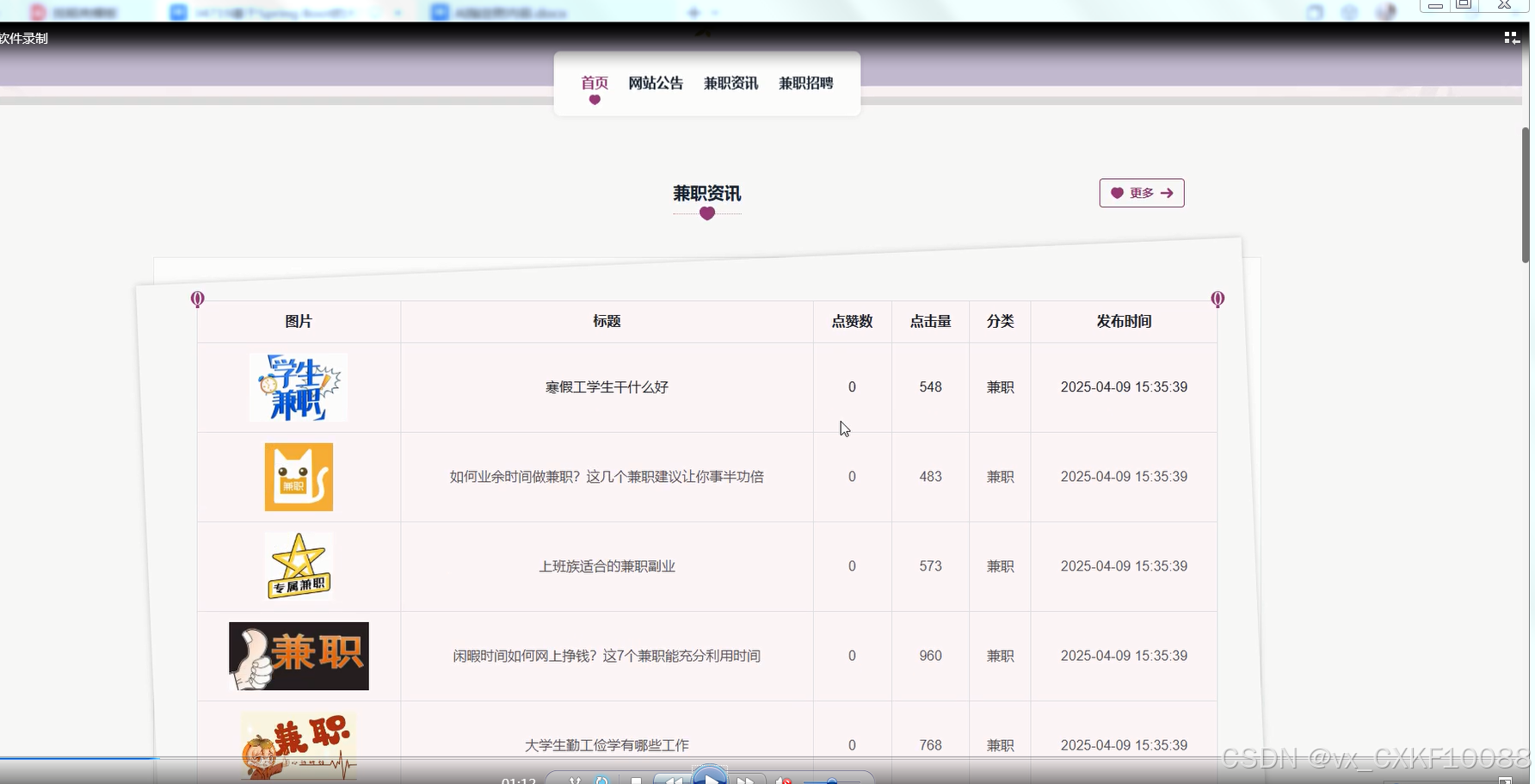 首页:展示最新的兼职招聘信息、新闻资讯以及网站公告,便于学生快速了解当前的兼职机会。