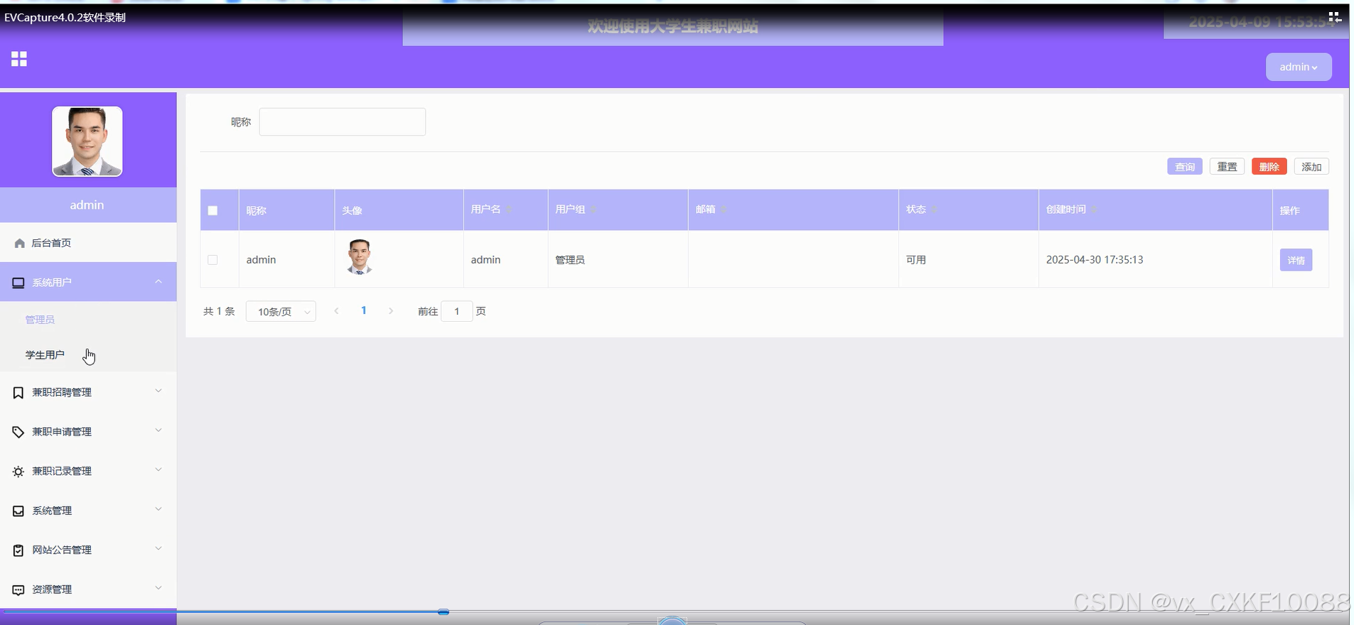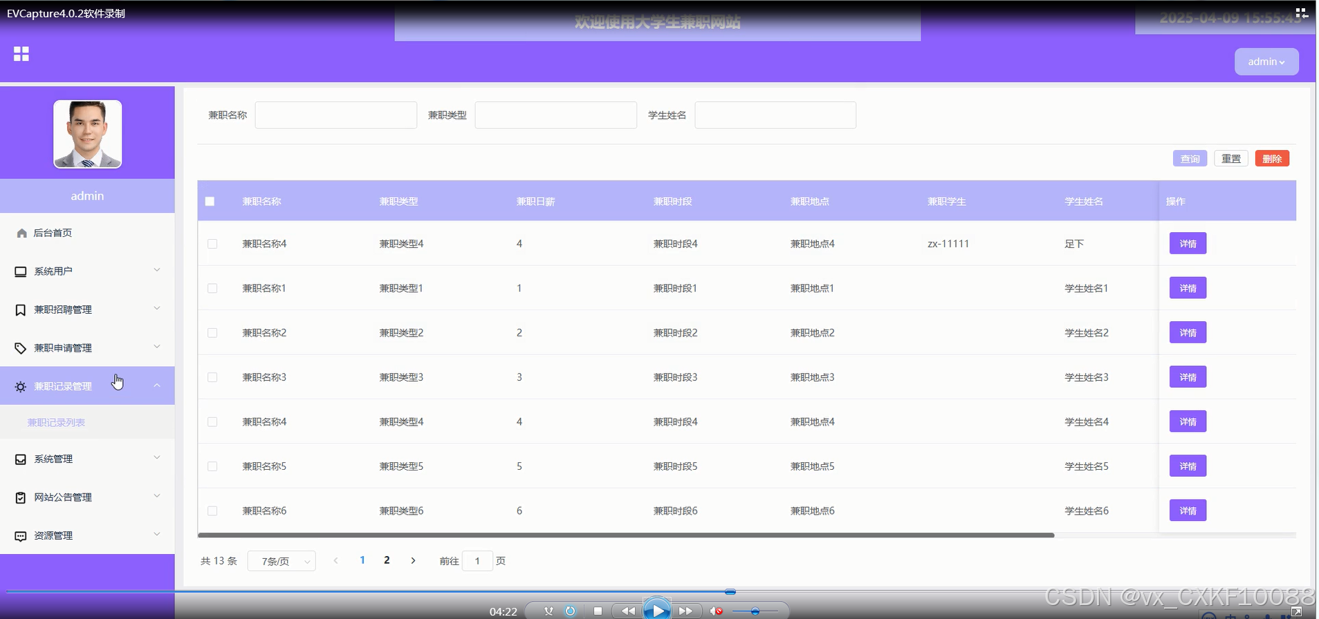 兼职记录管理:管理员能够查看学生参与兼职的历史记录,进行记录的维护和管理。
