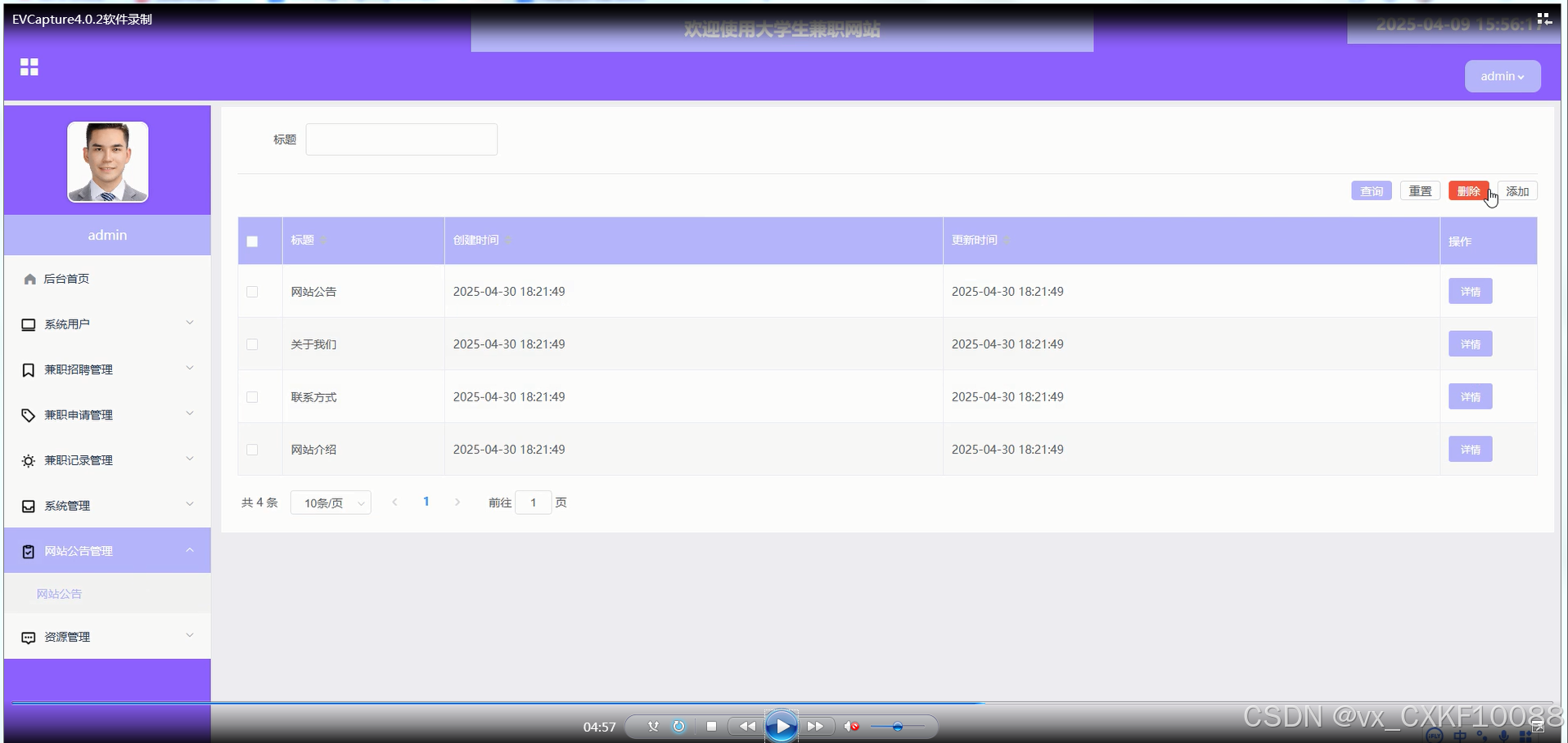 网站公告管理:管理员可以发布和管理网站公告,通知用户最新的兼职动态或系统更新。