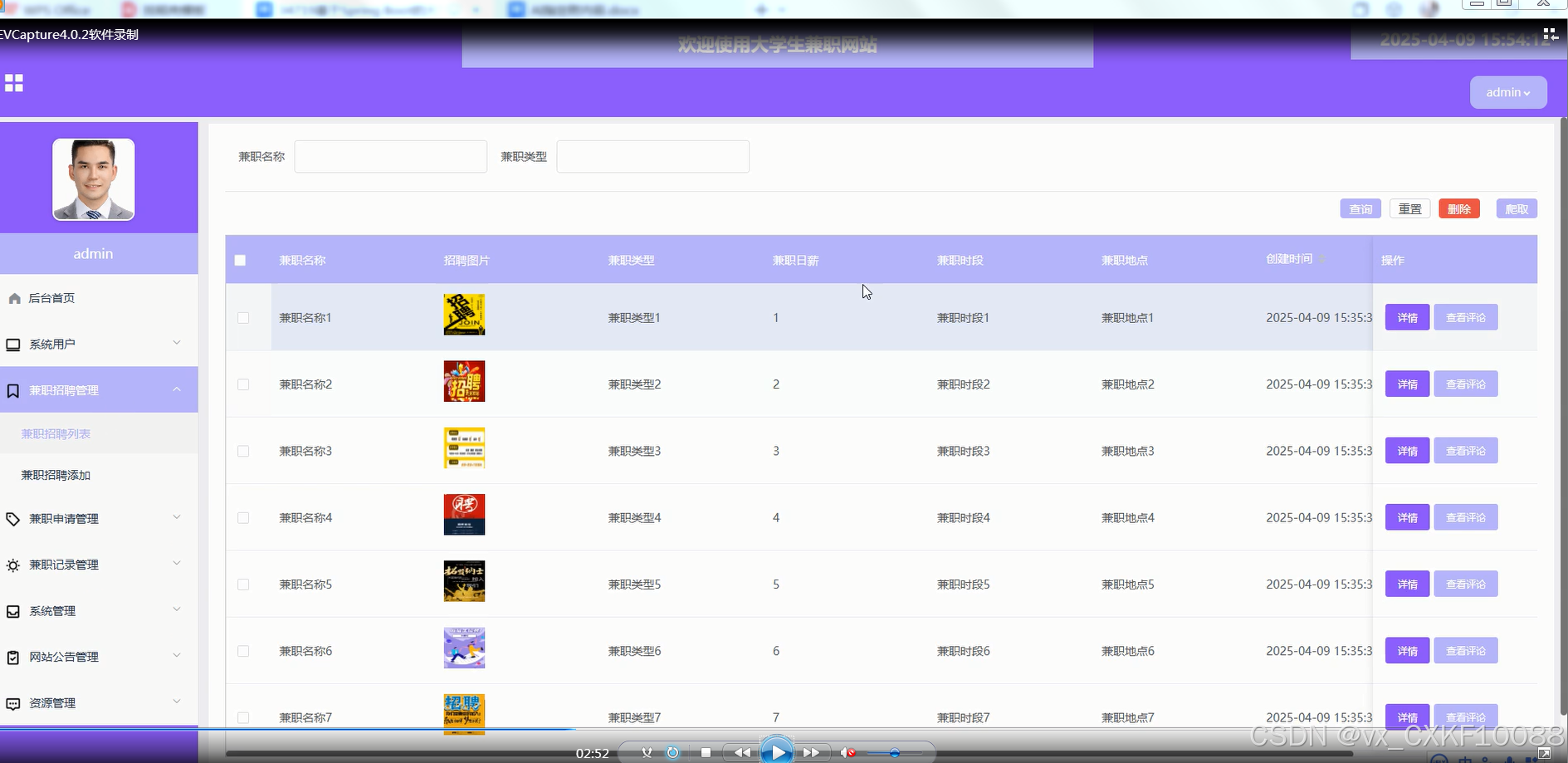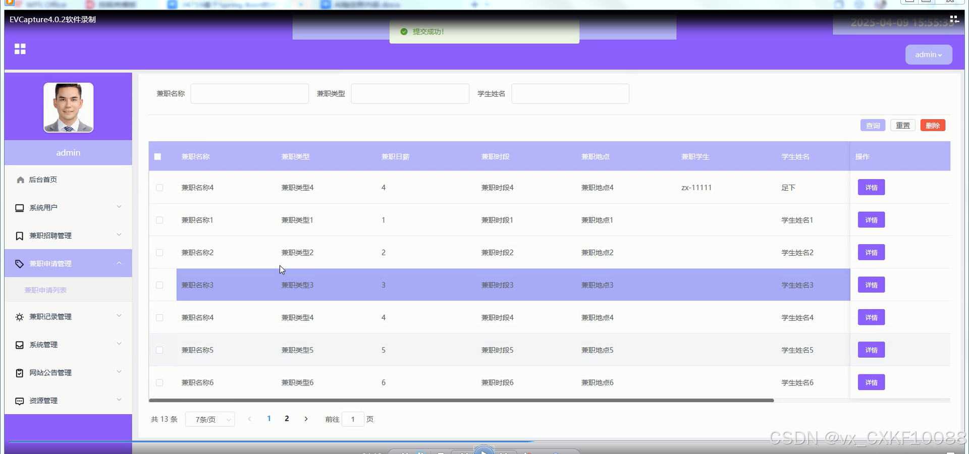 兼职申请管理:管理员可以查看学生的兼职申请情况,并进行审核操作,决定是否通过申请。