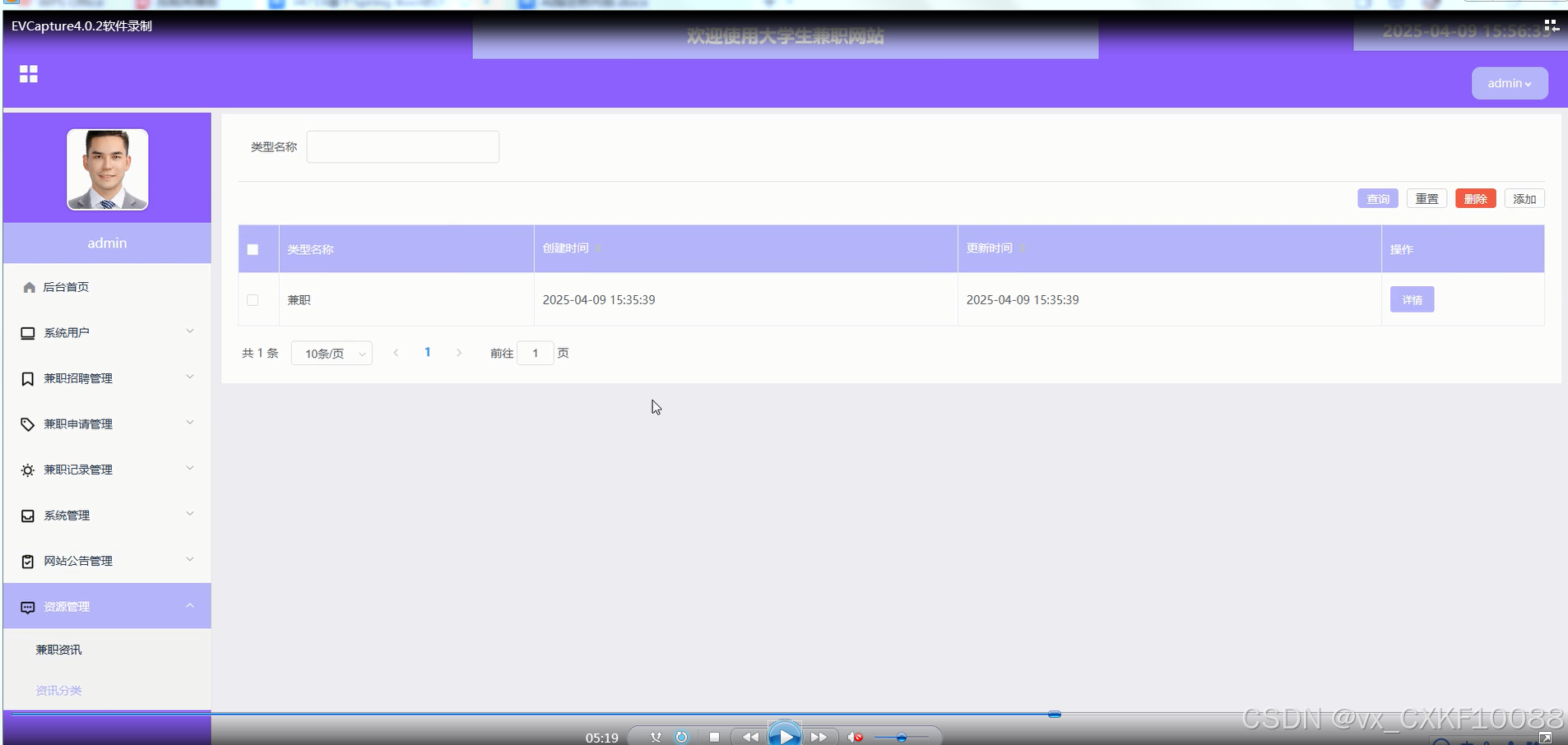 资源管理:管理员可以管理兼职资讯和分类,确保网站资讯的及时更新与分类清晰。资讯进行分类管理,优化信息检索与展示逻辑。