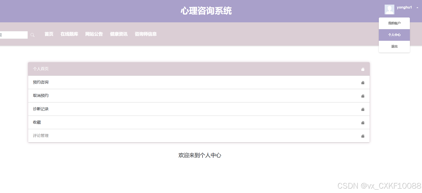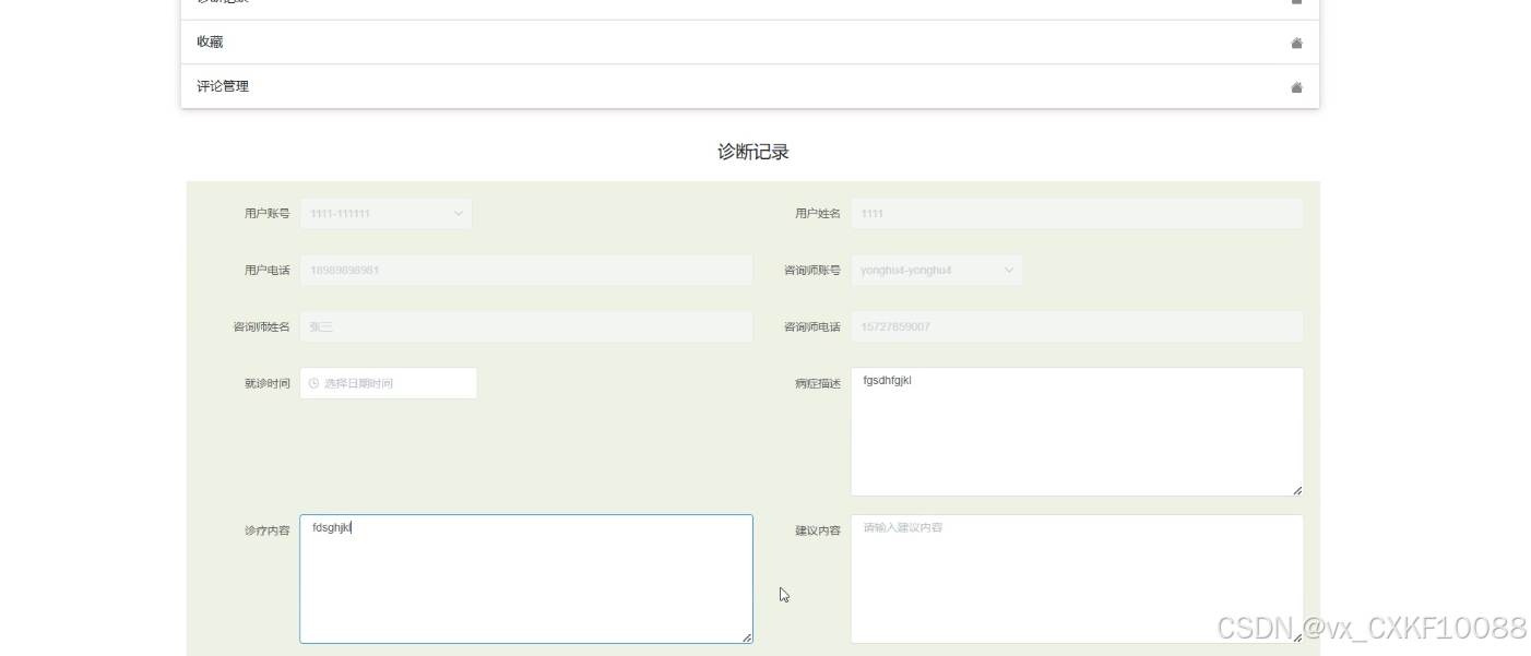 - 个人中心:用户可以访问个人首页,管理预约咨询,取消预约,查看诊断记录,以及管理自己的收藏和评论。个人中心是用户管理个人健康信息的私密空间,用户可以在这里记录自己的健康状况,跟踪健康进展,制定个性化的健康管理计划。