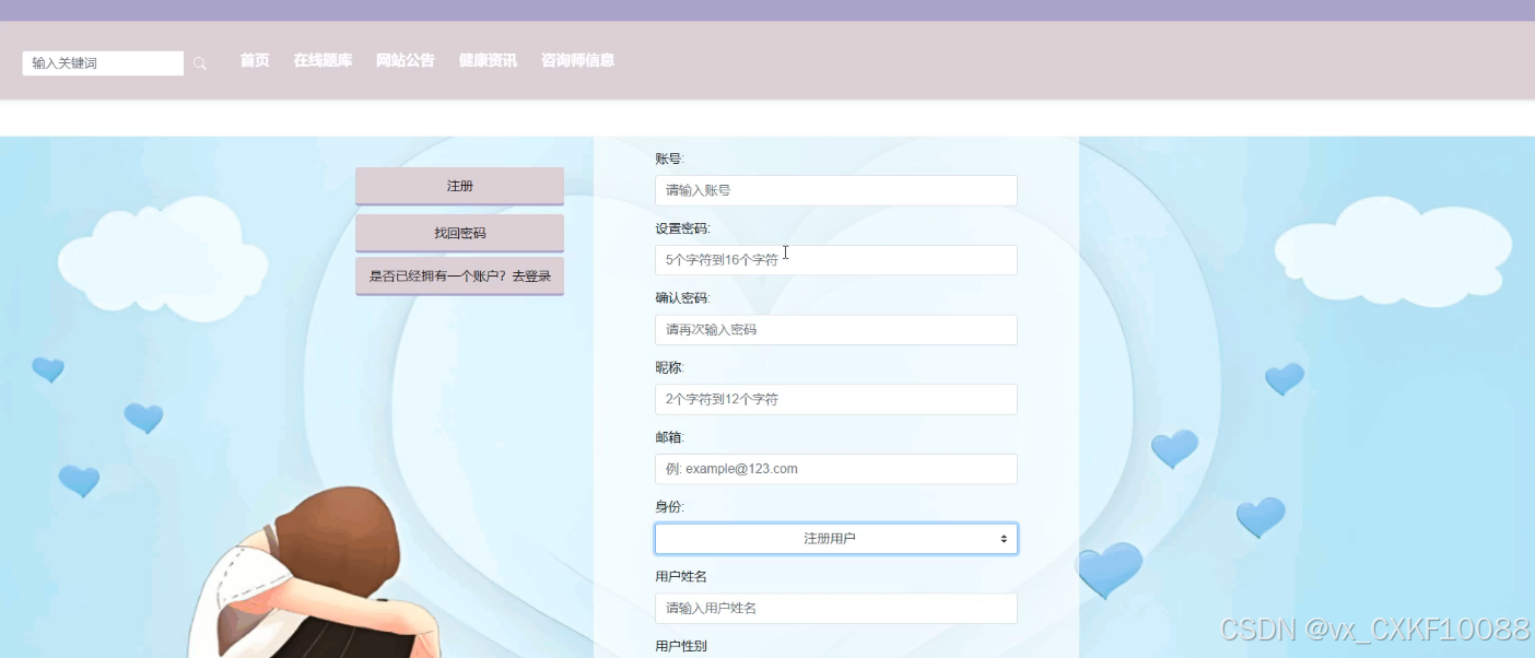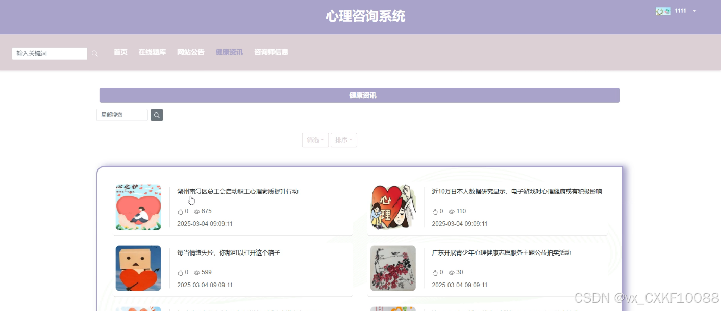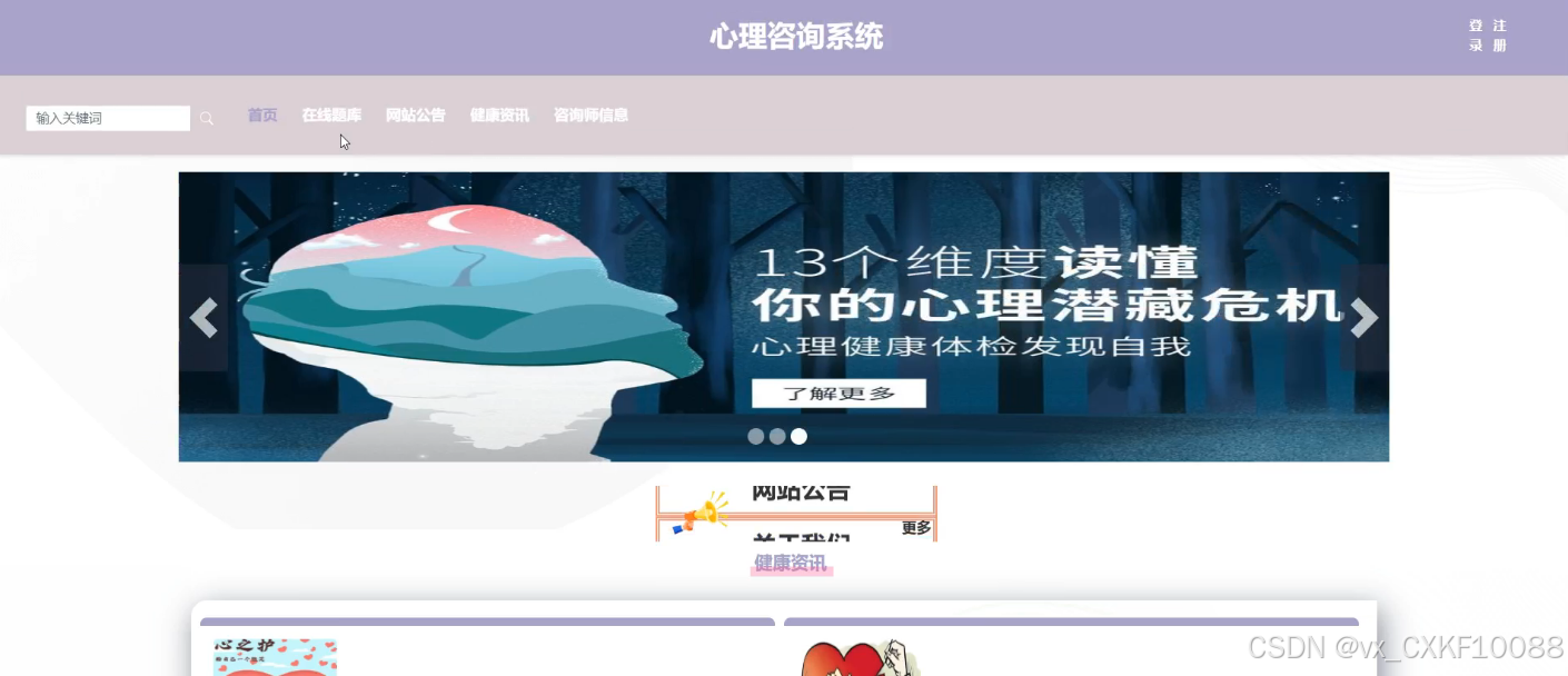 - 首页:网站的主界面,展示最新的健康资讯和咨询师信息,用户可以浏览并获取相关信息。这里不仅有最新的健康小贴士,还有各种健康生活的小窍门,旨在为用户提供一个全面了解健康知识的平台。
