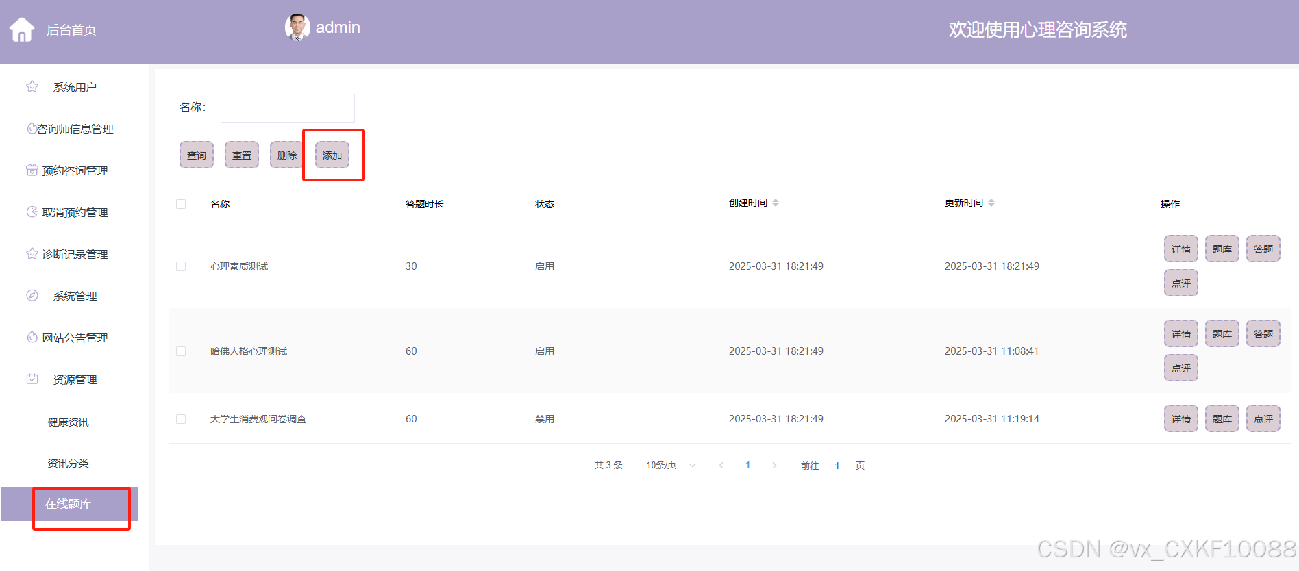 - 资源管理:管理员在这个模块中负责管理网站提供的健康资讯和资讯分类。管理员可以添加新的资讯内容,删除不再需要的资讯,查询和查看资讯的详细信息。此外,管理员还可以管理在线题库,进行题目的添加、删除、查询、答题、点评以及数据的导出和导入操作,以保证题库内容的丰富性和更新性。